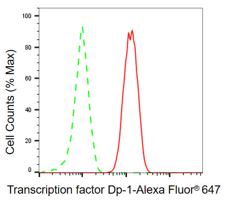 • Flow cytometric analysis of transcription factor Dp-1 expression in C2C12 cells using transcription factor Dp-1 antibody. Green, isotype control; red, transcription factor Dp-1.