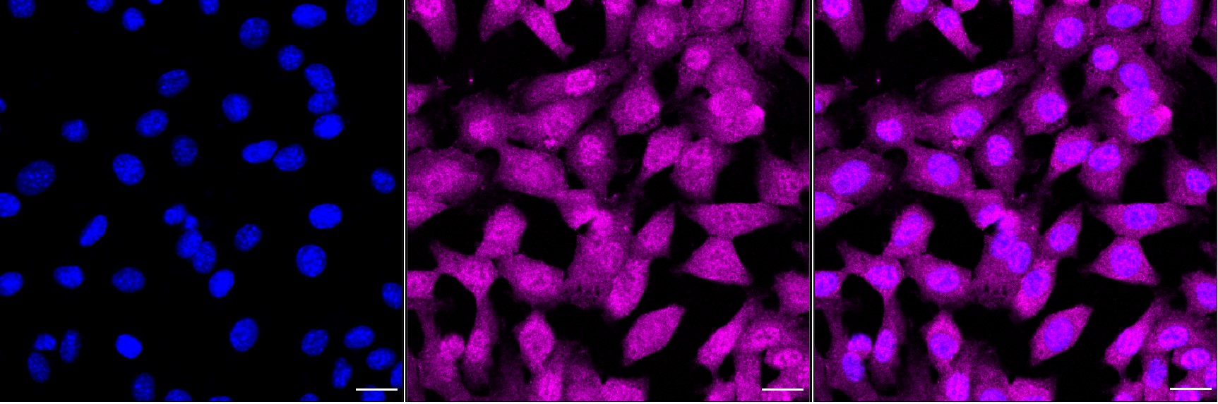 • Immunocytochemical staining of C2C12 cells with Transcription factor Dp-1 antibody. Nuclei were stained blue with DAPI; Transcription factor Dp-1 was stained magenta with Alexa Fluor? 647. Images were taken using Leica stellaris 5. Protein abundance based on laser Intensity and smart gain: Medium. Scale bar, 20 μm.