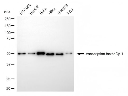 • Western blotting analysis using transcription factor Dp-1 antibody. Total cell lysates (30 μg) from various cell lines were loaded and separated by SDS-PAGE. The blot was incubated with transcription factor Dp-1 antibody and HRP-conjugated goat anti-rabbit secondary antibody respectively.