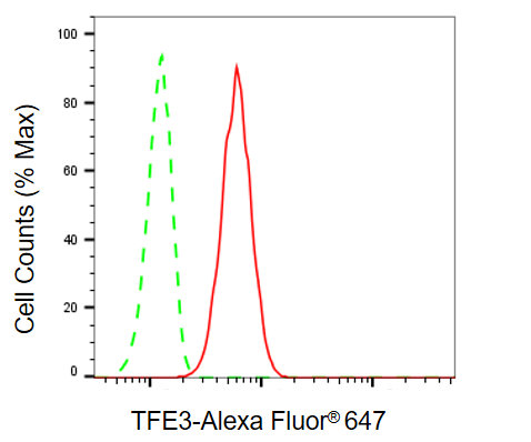 Flow cytometric analysis of TFE3 expression in H9c2 cells using TFE3 antibody. Green, isotype control; red, TFE3.