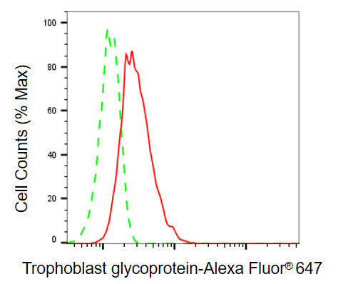 • Flow cytometric analysis of trophoblast glycoprotein expression in HAP-1 cells using trophoblast glycoprotein antibody. Green, isotype control; red, trophoblast glycoprotein.