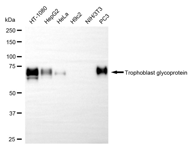 • Western blotting analysis using trophoblast glycoprotein antibody. Total cell lysates (30 μg) from various cell lines were loaded and separated by SDS-PAGE. The blot was incubated with trophoblast glycoprotein antibody and HRP-conjugated goat anti-rabbit secondary antibody respectively.