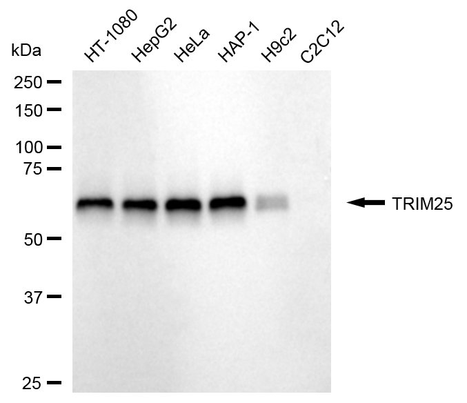 Western blotting analysis using TRIM25 antibody. Total cell lysates (5 μg) from various cell lines were loaded and separated by SDS-PAGE. The blot was incubated with TRIM25 antibody and HRP-conjugated goat anti-rabbit secondary antibody respectively.