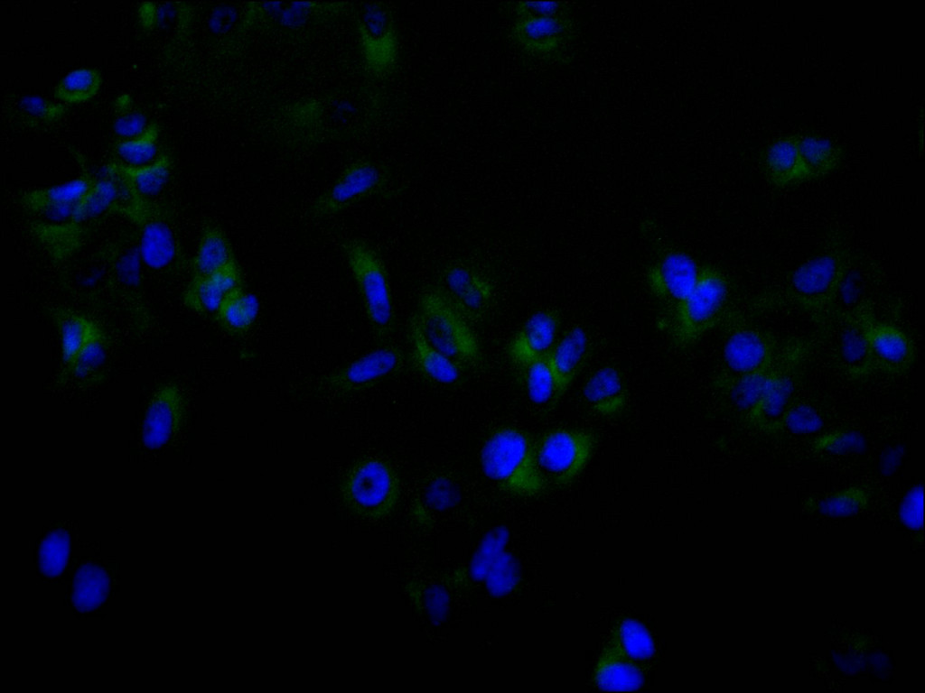 Immunofluorescence staining of MCF-7 cell with CSB-RA912122A0HU at 1:50, counter-stained with DAPI. The cells were fixed in 4% formaldehyde and blocked in 10% normal Goat Serum. The cells were then incubated with the antibody overnight at 4°C. The secondary antibody was Alexa Fluor 488-congugated AffiniPure Goat Anti-Rabbit IgG(H+L).