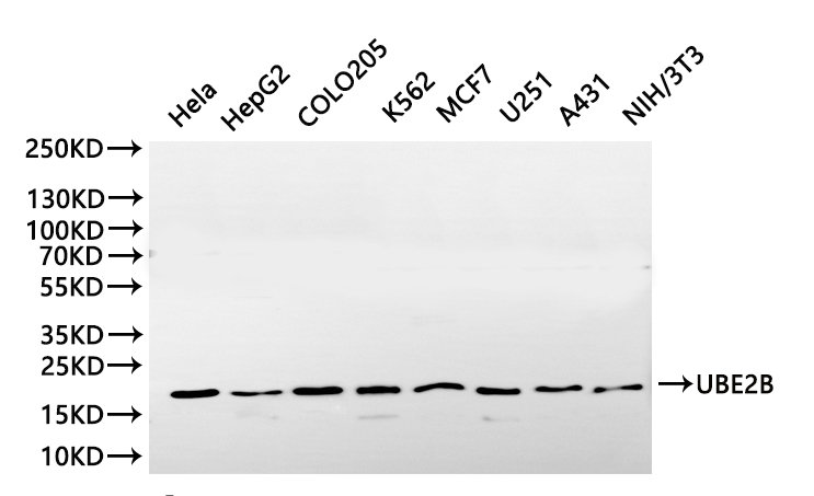 , Positive WB detected in:Hela whole cell lysate(30μg), COLO205 whole cell lysate(30μg), HepG2 whole cell lysate(30μg), K562 whole cell lysate(30μg), MCF7 whole cell lysate(30μg), U251 whole cell lysate(30μg), A431 whole cell lysate(30μg), NIH/3T3 whole cell lysate(30μg)