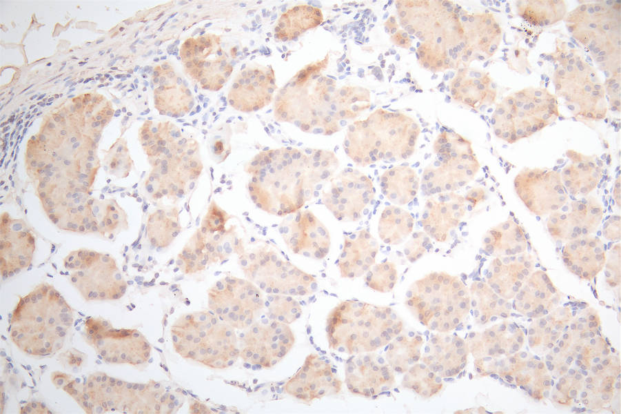 IHC image of CSB-RA025440MA1HU diluted at 1:300 and staining in paraffin-embedded human stomach tissue performed on a Leica BondTM system. After dewaxing and hydration, antigen retrieval was mediated by high pressure in a citrate buffer (pH 6.0). Section was blocked with 10% normal goat serum 30min at RT. Then primary antibody (1% BSA) was incubated at 4°C overnight. The primary is detected by a Goat anti-Mouse IgG labeled by HRP and visualized using 0.05% DAB.