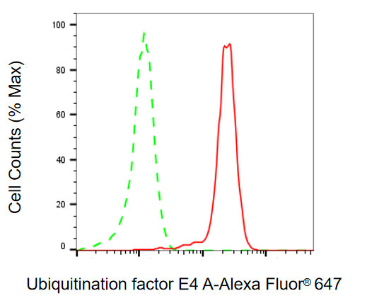 Flow cytometric analysis of ubiquitination factor E4 A expression in HepG2 cells using ubiquitination factor E4 A antibody. Green, isotype control; red, ubiquitination factor E4 A.