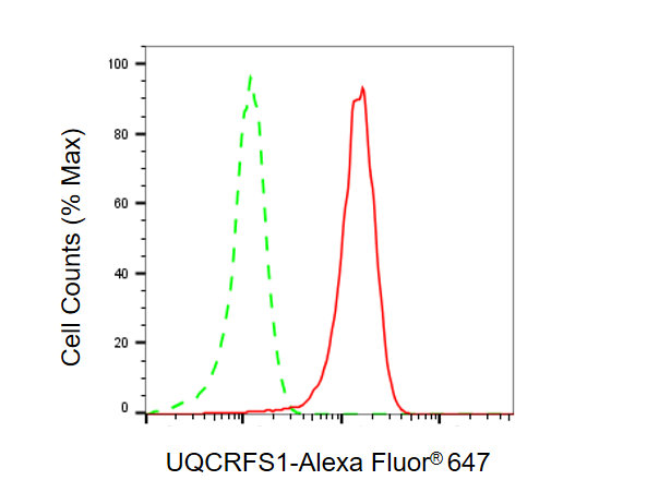 • Flow cytometric analysis of UQCRFS1 expression in HepG2 cells using UQCRFS1 antibody. Green, isotype control; red, UQCRFS1.