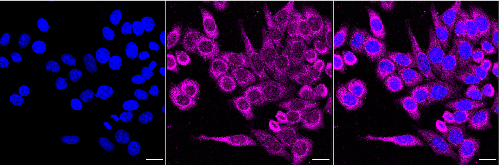 • Immunocytochemical staining of HepG2 cells with UQCRFS1 antibody. Nuclei were stained blue with DAPI; UQCRFS1 was stained magenta with Alexa Fluor? 647. Images were taken using Leica stellaris 5. Protein abundance based on laser Intensity and smart gain: Medium. Scale bar, 20 μm.