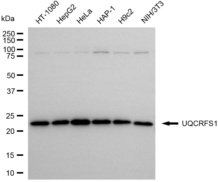 • Western blotting analysis using UQCRFS1 antibody. Total cell lysates (30 μg) from various cell lines were loaded and separated by SDS-PAGE. The blot was incubated with UQCRFS1 antibody and HRP-conjugated goat anti-rabbit secondary antibody respectively.