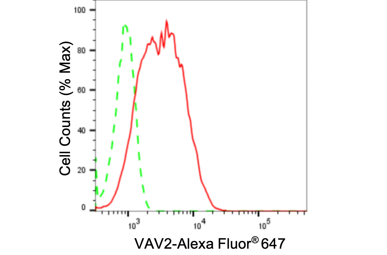 • Flow cytometric analysis of VAV2 expression in HepG2 cells using VAV2 antibody. Green, isotype control; red, VAV2.