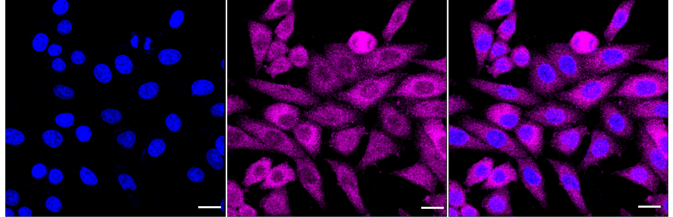 • Immunocytochemical staining of HepG2 cells with VAV2 antibody. Nuclei were stained blue with DAPI; VAV2 was stained magenta with Alexa Fluor? 647. Images were taken using Leica stellaris 5. Protein abundance based on laser Intensity and smart gain: Medium. Scale bar: 20 μm.