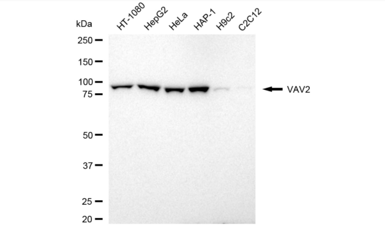 • Western blotting analysis using VAV2 antibody. Total cell lysates (30 μg) from various cell lines were loaded and separated by SDS-PAGE. The blot was incubated with VAV2 antibody and HRP-conjugated goat anti-rabbit secondary antibody respectively.