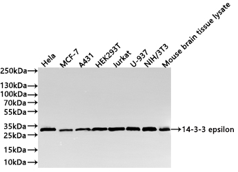 Positive WB detected in: Hela whole cell lysate(30μg), MCF-7 whole cell lysate(30μg), A431 whole cell lysate(30μg), HEK293T whole cell lysate(30μg), Jurkat whole cell lysate(30μg), U-937 whole cell lysate(30μg), NIH/3T3 whole cell lysate(30μg), Mouse brain tissue lysate(30μg)