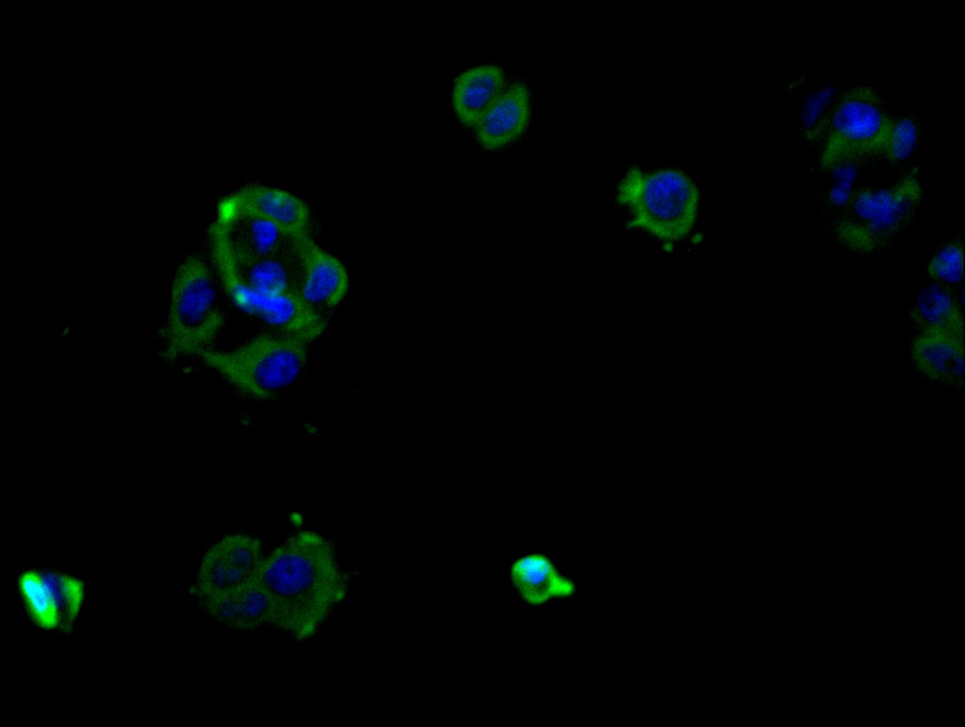 Immunofluorescence staining of MCF-7 cell with CSB-RA588316A0HU at 1:50, counter-stained with DAPI. The cells were fixed in 4% formaldehyde and blocked in 10% normal Goat Serum. The cells were then incubated with the antibody overnight at 4°C. The secondary antibody was Alexa Fluor 488-congugated AffiniPure Goat Anti-Rabbit IgG(H+L).