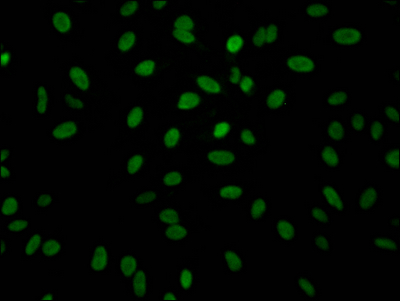 Immunofluorescence staining of Hela Cells with CSB-RA571479A0HU at 1:50, counter-stained with DAPI. The cells were fixed in 4% formaldehyde, permeated by 0.2% TritonX-100, and blocked in 10% normal Goat Serum. The cells were then incubated with the antibody overnight at 4℃. Nuclear DNA was labeled in blue with DAPI. The secondary antibody was FITC-conjugated AffiniPure Goat Anti-Rabbit IgG (H+L).