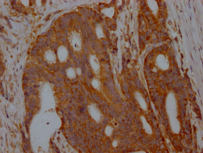 IHC image of CSB-RA571479A0HU diluted at 1:100 and staining in paraffin-embedded human colon cancer performed on a Leica BondTM system. After dewaxing and hydration, antigen retrieval was mediated by high pressure in a citrate buffer (pH 6.0). Section was blocked with 10% normal goat serum 30min at RT. Then primary antibody (1% BSA) was incubated at 4℃ overnight. The primary is detected by a Goat anti-rabbit IgG polymer labeled by HRP and visualized using 0.05% DAB.