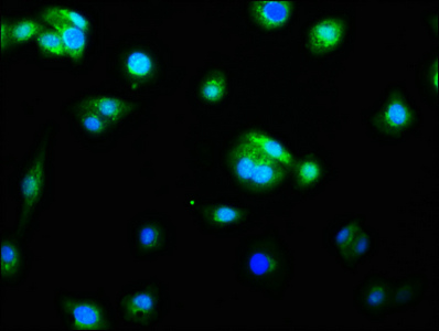 Immunofluorescence staining of HepG2 cells with CSB-RA004555A0HU at 1:60, counter-stained with DAPI. The cells were fixed in 4% formaldehyde, permeabilized using 0.2% Triton X-100 and blocked in 10% normal Goat Serum. The cells were then incubated with the antibody overnight at 4℃. The secondary antibody was Alexa Fluor 488-congugated AffiniPure Goat Anti-Rabbit IgG (H+L).