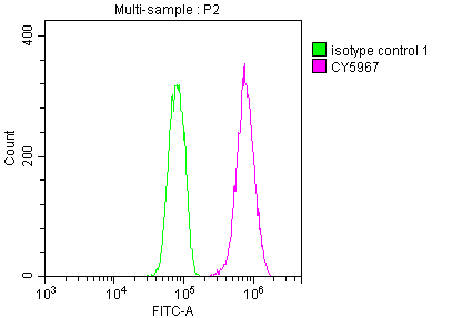 • Overlay histogram showing Hela cells stained with CSB-RA964136A0HU (red line) at 1:50. The cells were fixed with 70% Ethylalcohol (18h) and then incubated in 10% normal goat serum to block non-specific protein-protein interactions followedby the antibody (1μg/1*106 cells) for 1 h at 4℃.The secondary antibody used was FITC-conjugated goat anti-rabbit IgG (H+L) at 1/200 dilution for 30min at 4℃. Control antibody (green line) was Rabbit IgG (1μg/1*106 cells) used under the same conditions. Acquisition of >10,000 events was performed.