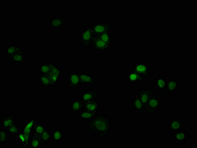 • Immunofluorescence staining of HepG2 cells with CSB-RA005087A0HU at 1:32.5, counter-stained with DAPI. The cells were fixed in 4% formaldehyde, permeabilized using 0.2% Triton X-100 and blocked in 10% normal Goat Serum. The cells were then incubated with the antibody overnight at 4℃. The secondary antibody was Alexa Fluor 488-congugated AffiniPure Goat Anti-Rabbit IgG (H+L).