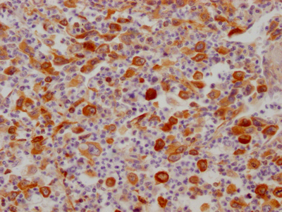 IHC image of CSB-RA909932A0HU diluted at 1:100 and staining in paraffin-embedded human lung cancer performed on a Leica BondTM system. After dewaxing and hydration, antigen retrieval was mediated by high pressure in a citrate buffer (pH 6.0). Section was blocked with 10% normal goat serum 30min at RT. Then primary antibody (1% BSA) was incubated at 4℃ overnight. The primary is detected by a Goat anti-rabbit IgG polymer labeled by HRP and visualized using 0.05% DAB.
