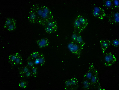 Immunofluorescence staining of HepG2 cells with CSB-RA009986A0HU at 1:41, counter-stained with DAPI. The cells were fixed in 4% formaldehyde, permeabilized using 0.2% Triton X-100 and blocked in 10% normal Goat Serum. The cells were then incubated with the antibody overnight at 4℃. The secondary antibody was Alexa Fluor 488-congugated AffiniPure Goat Anti-Rabbit IgG (H+L).