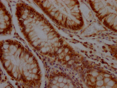 IHC image of CSB-RA194949A0HU diluted at 1:100 and staining in paraffin-embedded human colon cancer performed on a Leica BondTM system. After dewaxing and hydration, antigen retrieval was mediated by high pressure in a citrate buffer (pH 6.0). Section was blocked with 10% normal goat serum 30min at RT. Then primary antibody (1% BSA) was incubated at 4℃ overnight. The primary is detected by a Goat anti-rabbit IgG polymer labeled by HRP and visualized using 0.05% DAB.