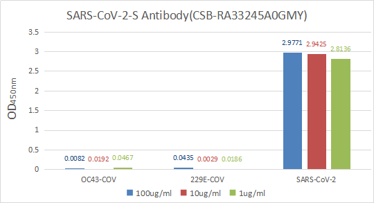 ELISA: Immobilize various types of SARS proteins at concentration of 2μg/ml on solid substrate, then react with SARS-CoV-2-S Antibody at concentration of 100μg/ml, 10μg/ml and 1μg/ml. It shows the SARS-CoV-2-S Antibody (CSB-RA33245A0GMY) is specific for SARS-CoV-2-S1-RBD protein, without any cross-reactivity with HCoV-OC43, HCoV-229E.