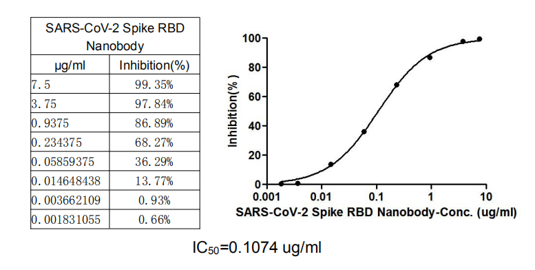 SARS-CoV-2 Spike RBD Nanobody (CSB-RA33245A2GMY) competitively prevented SARS-CoV-2-S1-RBD (CSB-YP3324GMY1) from binding to ACE2-HRP conjugate (CSB-MP866317HU). The inhibition efficacy of the SARS-CoV-2-S1-RBD/ACE2 binding was positively proportionally to the SARS-CoV-2 Spike RBD Nanobody concentrations. It showed that this SARS-CoV-2 Spike RBD Nanobody effectively inhibited the SARS-CoV-2-S1-RBD/ACE2 binding. And the IC50 of this SARS-CoV-2 Spike RBD Nanobody is 0.1074 μg/ml.