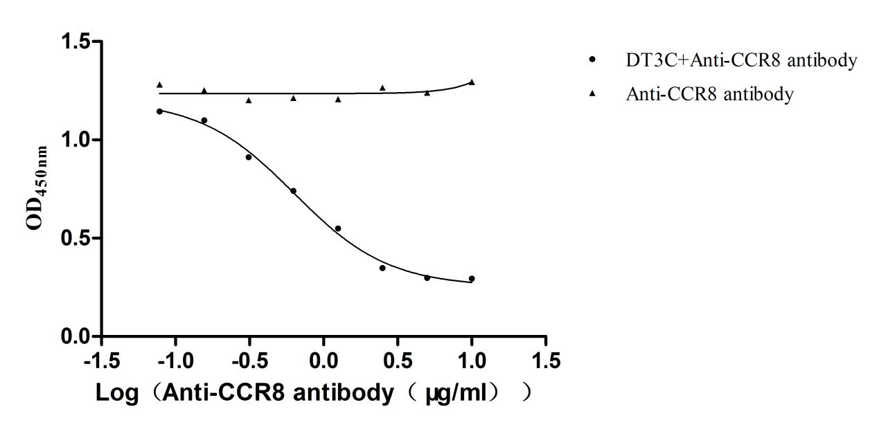 After DT3C 10μg/ml formed complexes with different concentrations of Anti-CCR8 antibodies (CSB-RA004847MA3HU), cytotoxicity experiments were conducted on CHOK1/Human CCR8 cells (CSB-SC004847HU2). The ED50 is 0.3708-0.5608 μg/ml. Biological Activity Assay -
