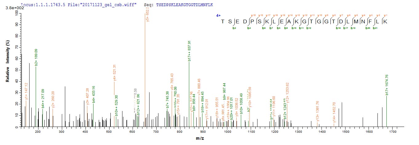 Based on the SEQUEST from database of E.coli host and target protein, the LC-MS/MS Analysis result of CSB-EP010996HU could indicate that this peptide derived from E.coli-expressed Homo sapiens (Human) IDO1.