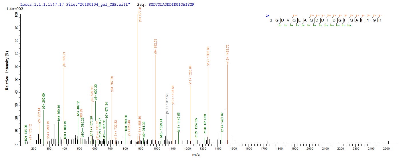 Based on the SEQUEST from database of E.coli host and target protein, the LC-MS/MS Analysis result of CSB-RP070094h could indicate that this peptide derived from E.coli-expressed Homo sapiens (Human) MMP1.