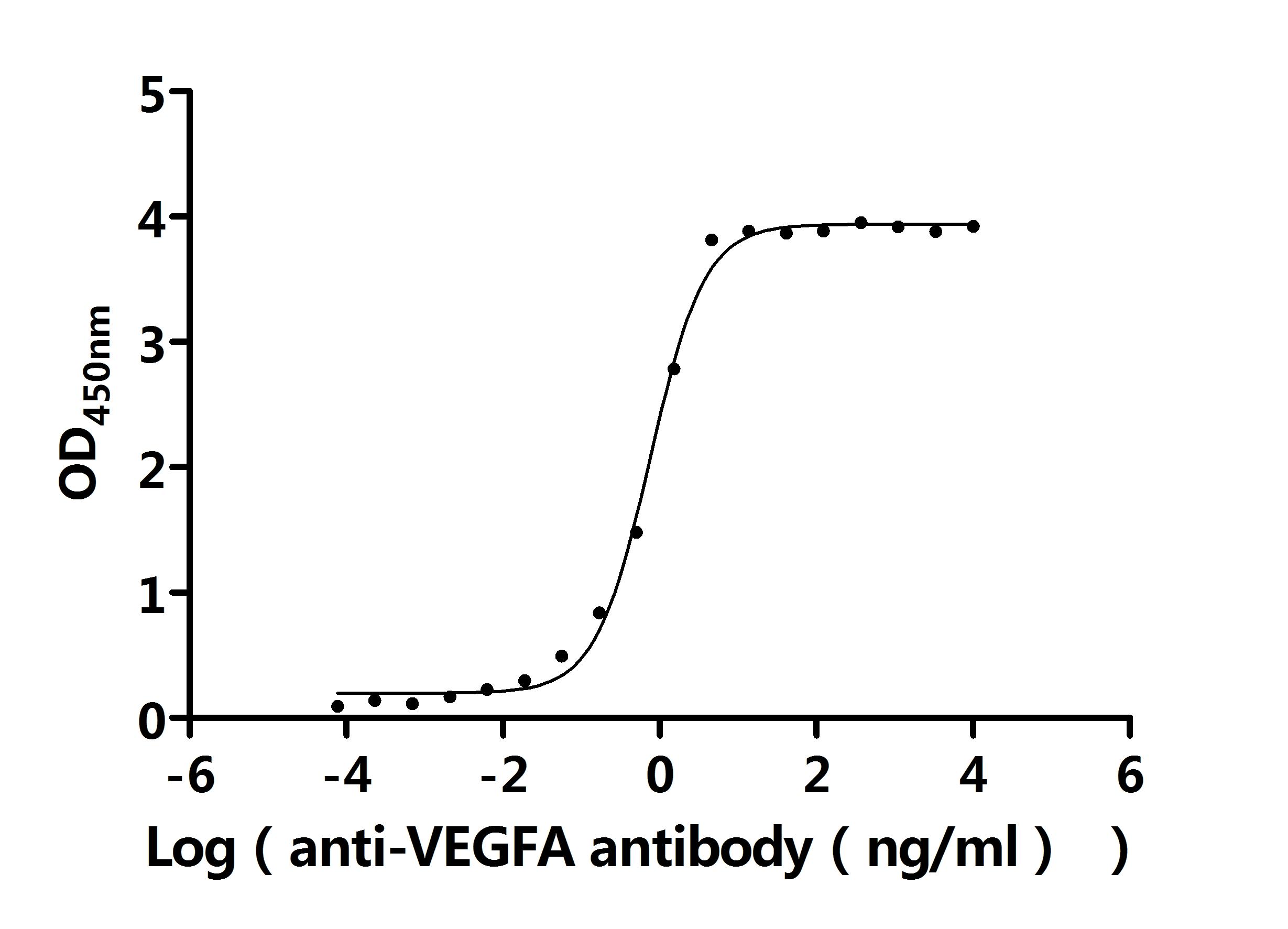 生物活性:①Measured by its binding ability in a functional ELISA. Immobilized Human VEGFA protein at 2 μg/mL can bind Anti-VEGFA recombinant antibody (CSB-RA025833MA2HU). The EC50 is 0.6797-0.8382 ng/mL.
