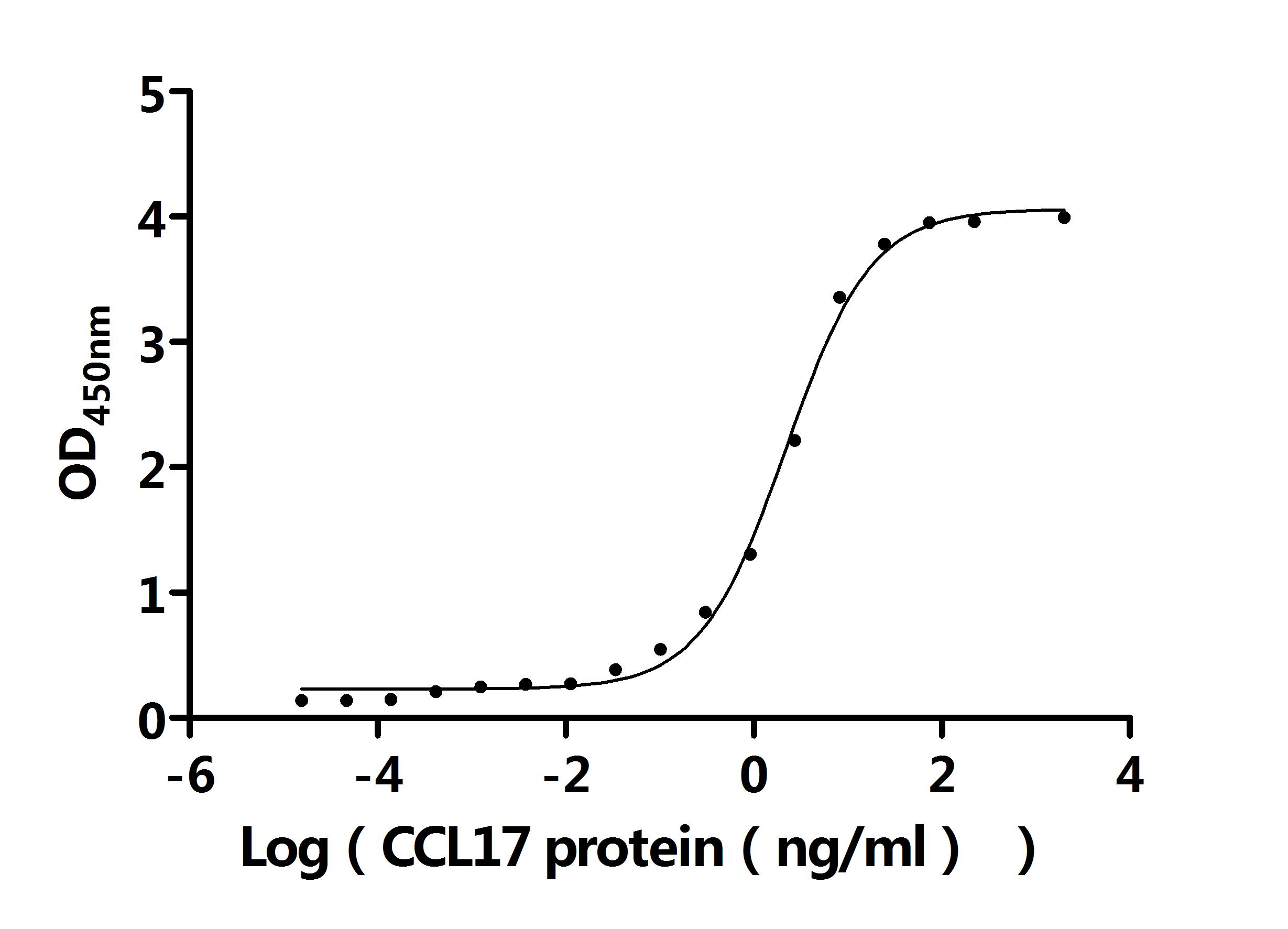 Measured by its binding ability in a functional ELISA. Immobilized Anti-CCL17 recombinant antibody (CSB-RA856406MA1HU) at 2 μg/ml can bind Macaca mulatta CCL17 protein. The EC50 is 1.953-2.469 ng/mL. Biological Activity Assay