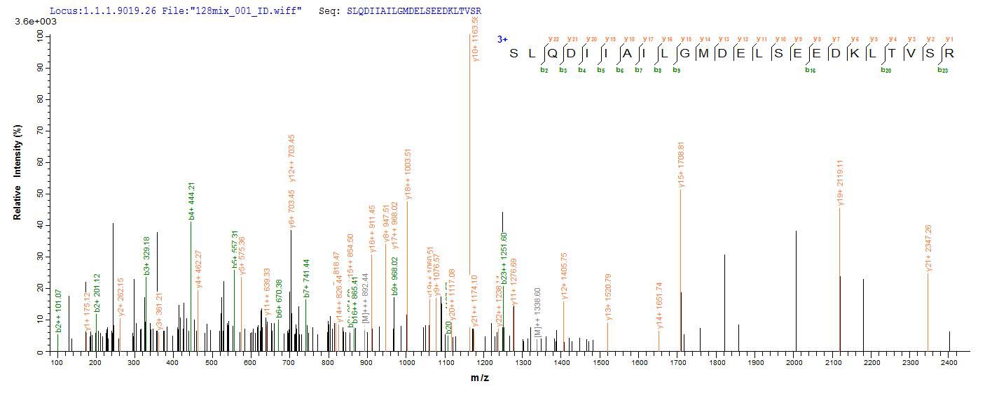 Based on the SEQUEST from database of E.coli host and target protein, the LC-MS/MS Analysis result of CSB-EP002350MO could indicate that this peptide derived from E.coli-expressed Mus musculus (Mouse) Atp5b.