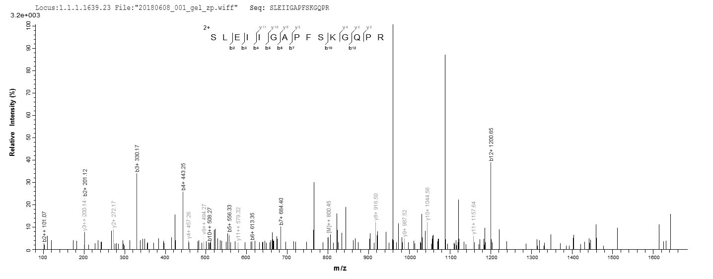 Based on the SEQUEST from database of E.coli host and target protein, the LC-MS/MS Analysis result of CSB-EP733775MO could indicate that this peptide derived from E.coli-expressed Mus musculus (Mouse) Arg1.