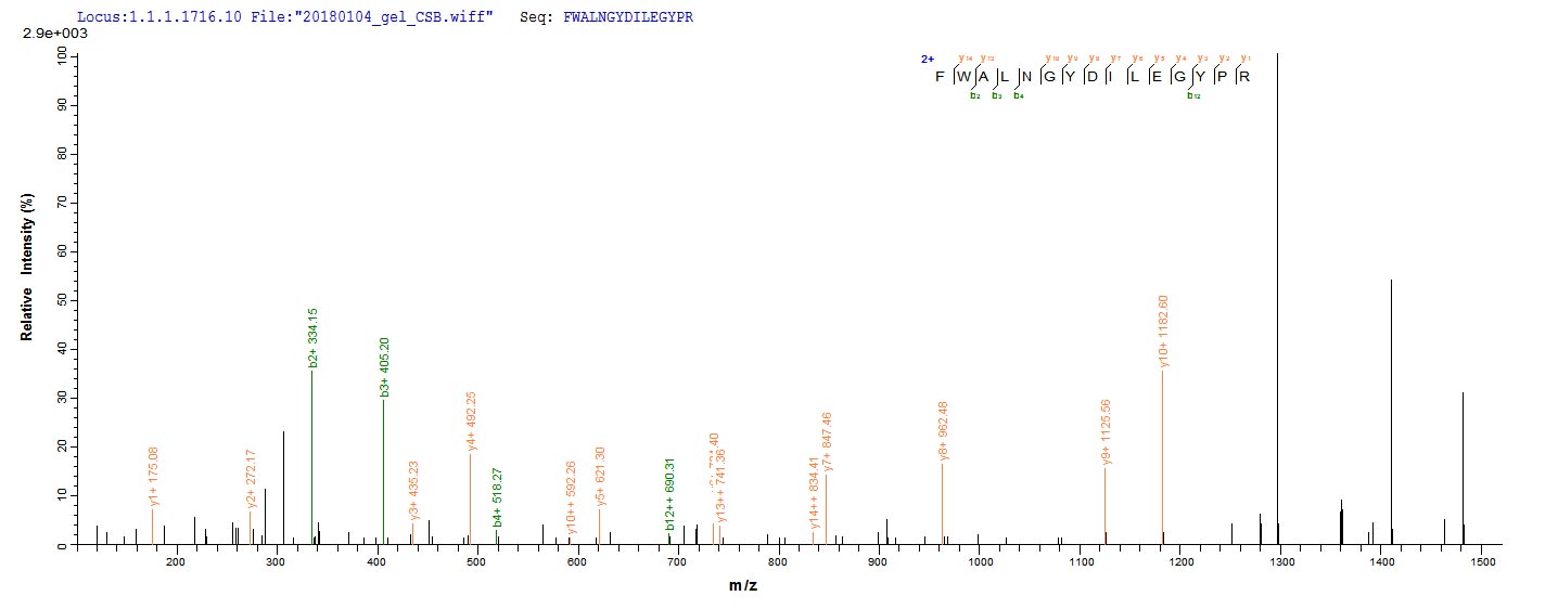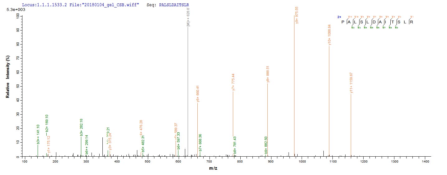 Based on the SEQUEST from database of E.coli host and target protein, the LC-MS/MS Analysis result of CSB-RP177394m could indicate that this peptide derived from E.coli-expressed Mus musculus (Mouse) Mmp13.