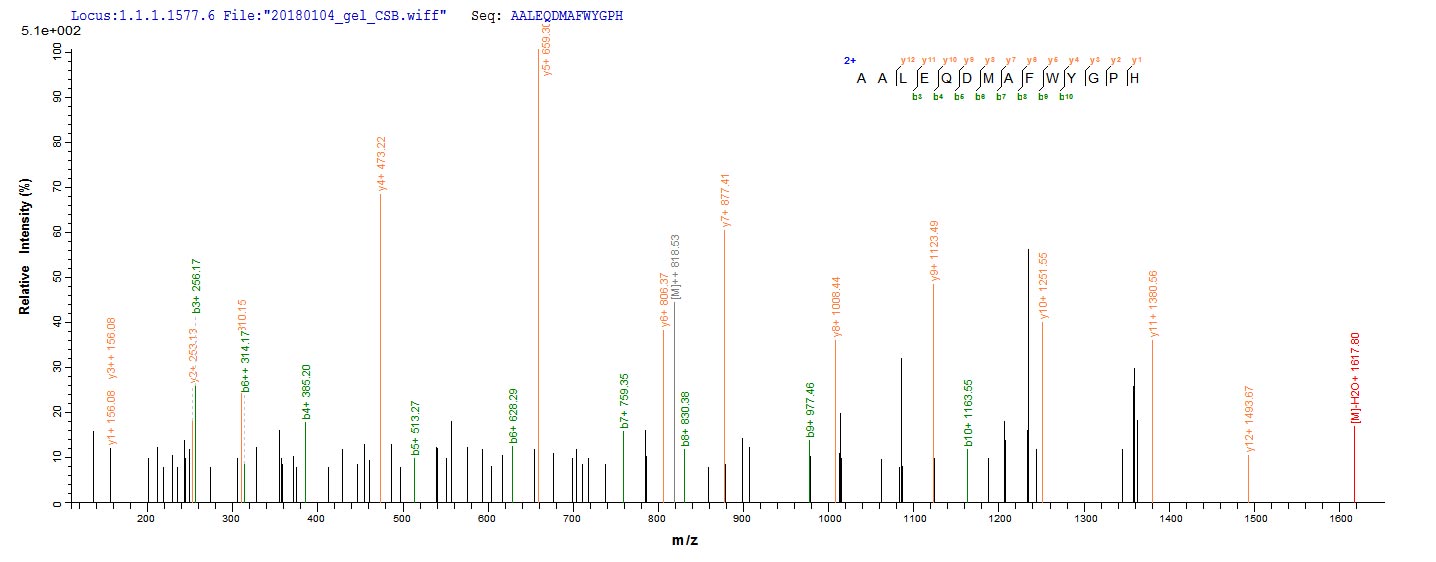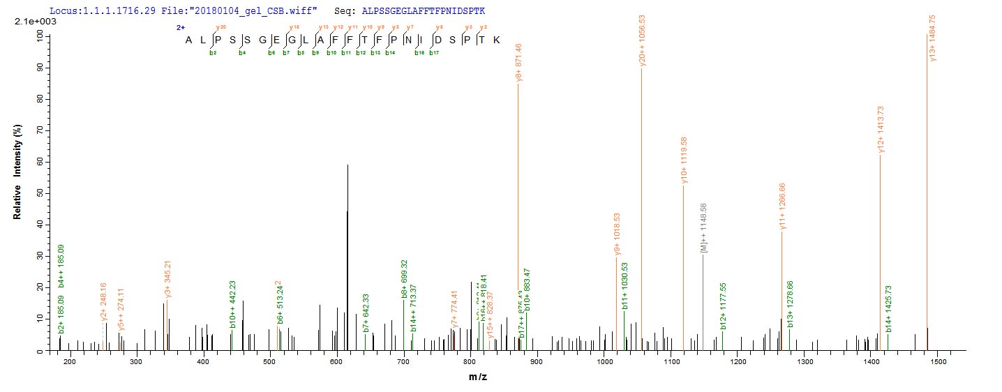 Based on the SEQUEST from database of Yeast host and target protein, the LC-MS/MS Analysis result of CSB-YP010583MO could indicate that this peptide derived from Yeast-expressed Mus musculus (Mouse) Hmox1.