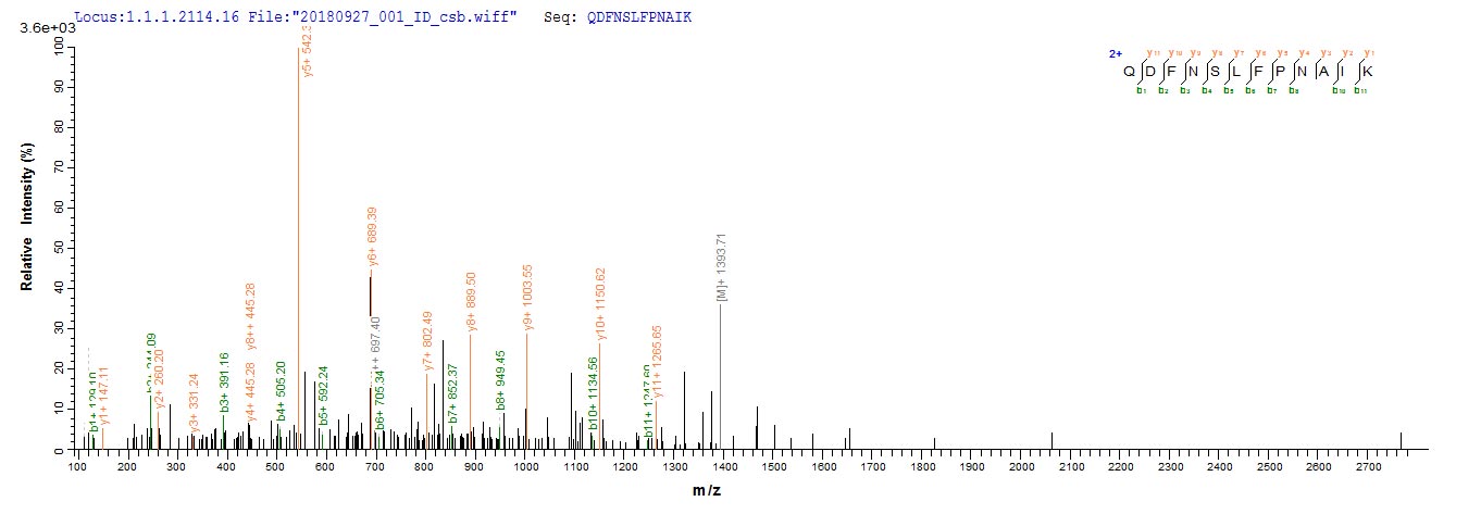 Based on the SEQUEST from database of E.coli host and target protein, the LC-MS/MS Analysis result of CSB-EP019573MO could indicate that this peptide derived from E.coli-expressed Mus musculus (Mouse) Retn.