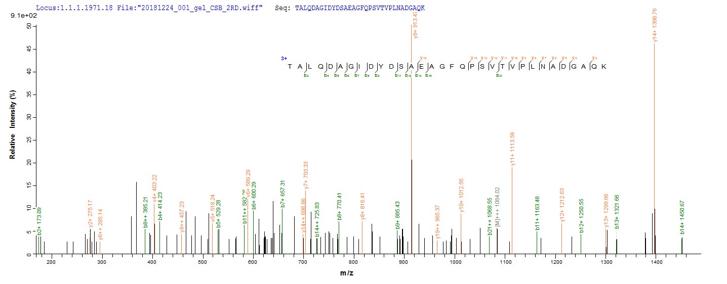 Based on the SEQUEST from database of E.coli host and target protein, the LC-MS/MS Analysis result of CSB-EP352276MLA could indicate that this peptide derived from E.coli-expressed Mycobacterium paratuberculosis (strain ATCC BAA-968 / K-10) MAP_1030.