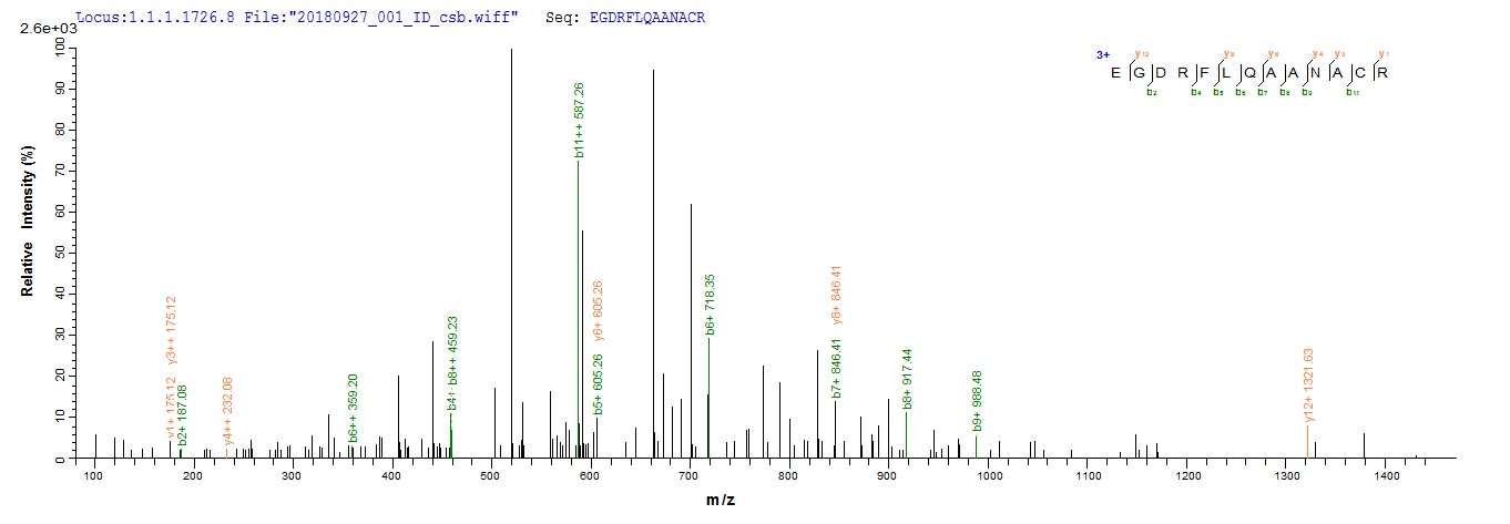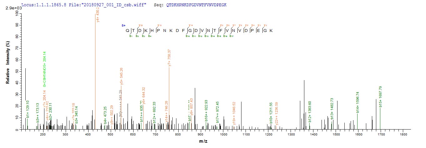 Based on the SEQUEST from database of E.coli host and target protein, the LC-MS/MS Analysis result of CSB-EP511311ETF could indicate that this peptide derived from E.coli-expressed Penaeus monodon (Giant tiger prawn) AK.