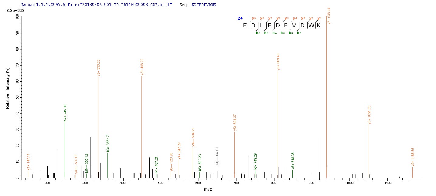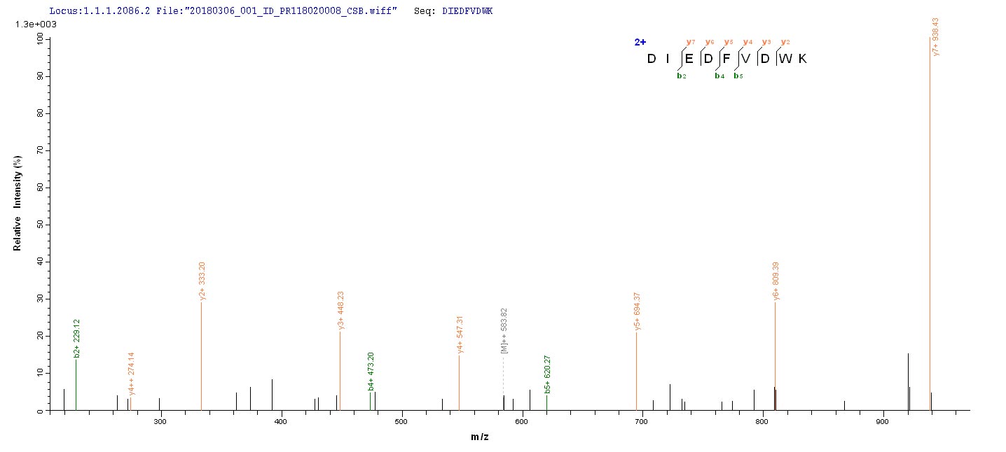 Based on the SEQUEST from database of E.coli host and target protein, the LC-MS/MS Analysis result of CSB-EP310587EYA could indicate that this peptide derived from E.coli-expressed Porphyromonas gingivalis (strain ATCC BAA-308 / W83) rgpB.