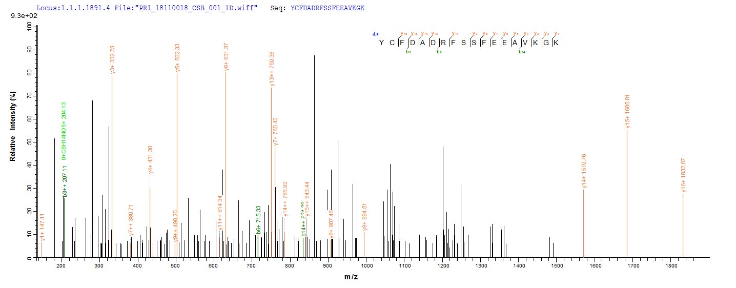 Based on the SEQUEST from database of Yeast host and target protein, the LC-MS/MS Analysis result of CSB-YP019068HU could indicate that this peptide derived from Yeast-expressed Homo sapiens (Human) PTPRZ1.