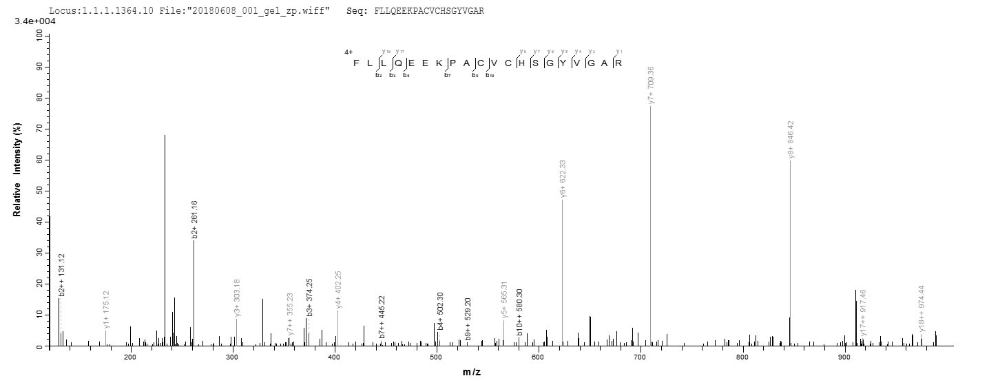 Based on the SEQUEST from database of E.coli host and target protein, the LC-MS/MS Analysis result of CSB-EP023445SH could indicate that this peptide derived from E.coli-expressed Ovis aries (Sheep) TGFA.