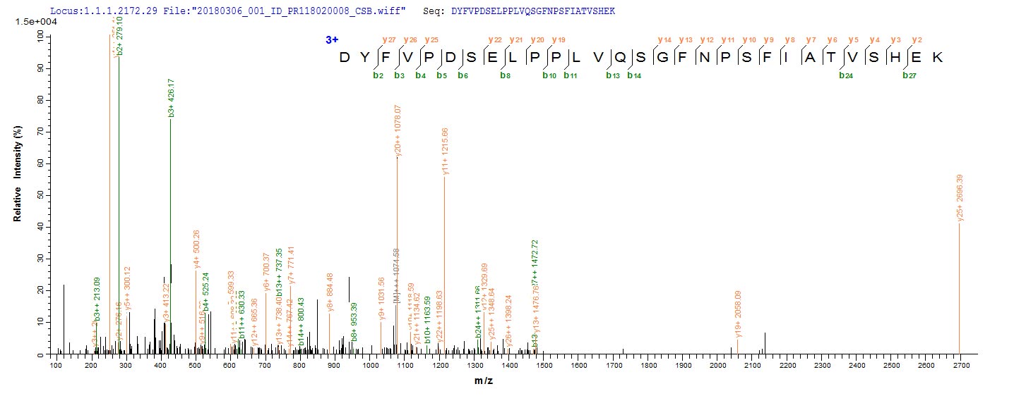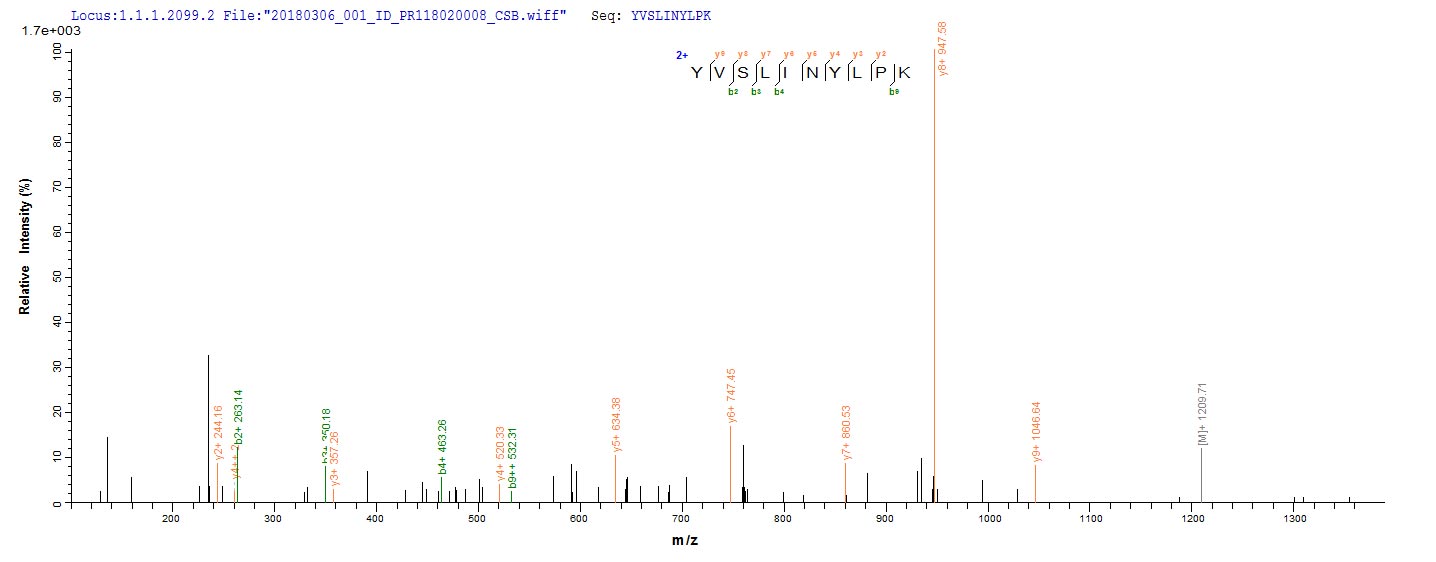 Based on the SEQUEST from database of E.coli host and target protein, the LC-MS/MS Analysis result of CSB-EP739984SKX could indicate that this peptide derived from E.coli-expressed Staphylococcus aureus (strain MRSA252) hlgC.