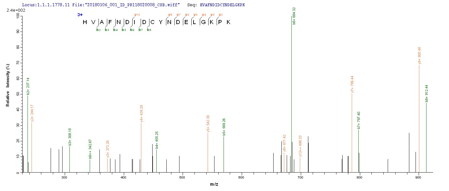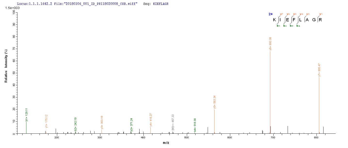 Based on the SEQUEST from database of E.coli host and target protein, the LC-MS/MS Analysis result of CSB-EP740005SKV could indicate that this peptide derived from E.coli-expressed Staphylococcus aureus (strain MRSA252) acpS.