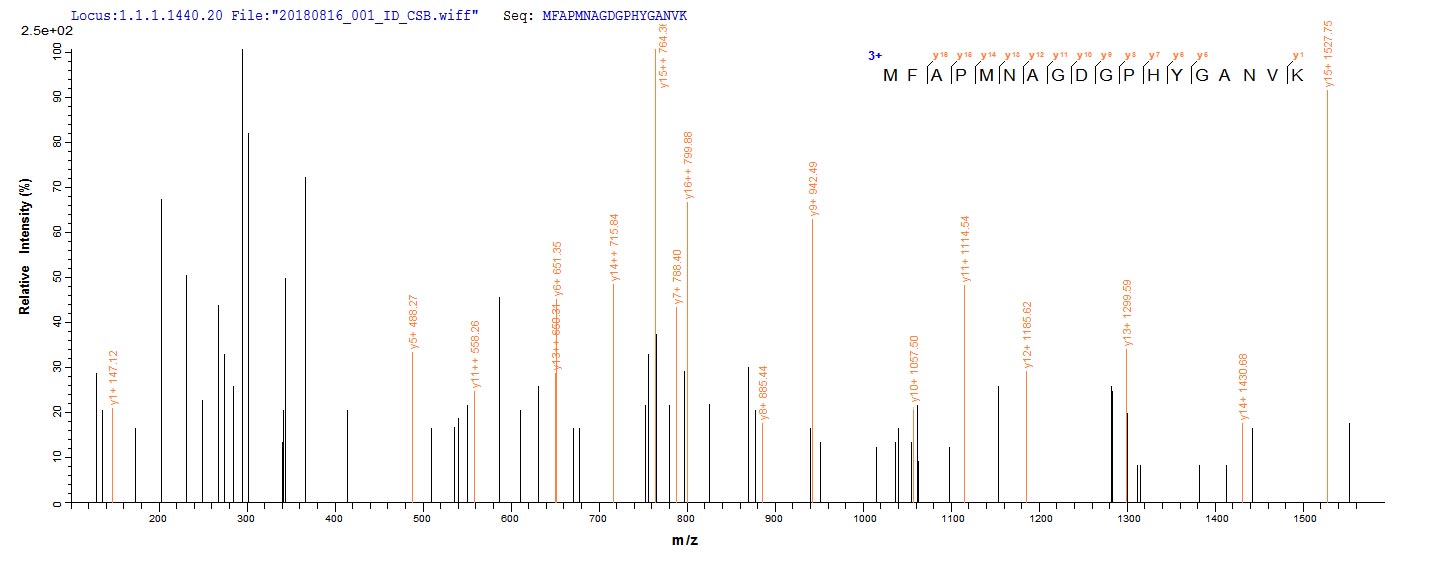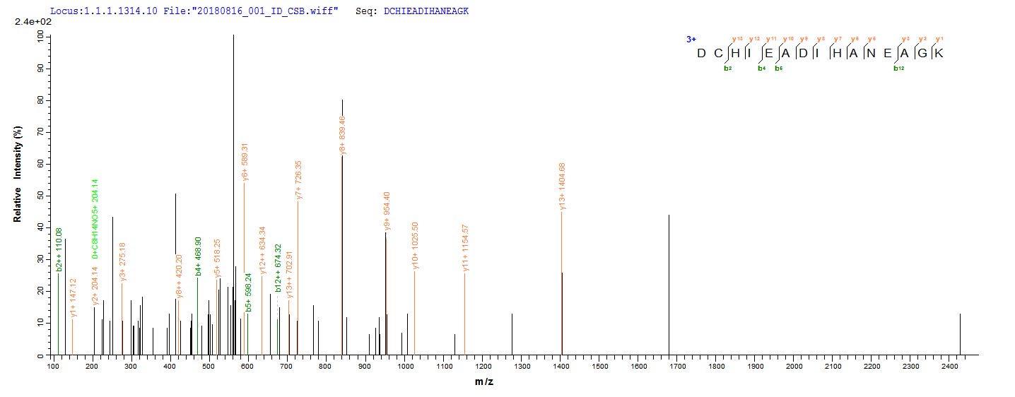Based on the SEQUEST from database of E.coli host and target protein, the LC-MS/MS Analysis result of CSB-EP322536TPR could indicate that this peptide derived from E.coli-expressed Treponema pallidum (strain Nichols) tpd.
