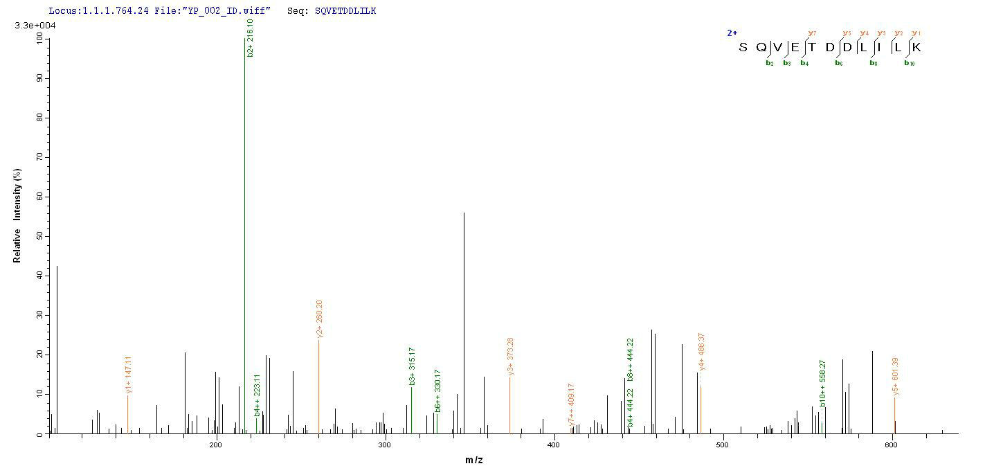 Based on the SEQUEST from database of Yeast host and target protein, the LC-MS/MS Analysis result of CSB-YP001964MO1 could indicate that this peptide derived from Yeast-expressed Mus musculus (Mouse) Aqp4.