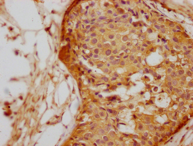 IHC image of CSB-MA754656A0m diluted at 1:150 and staining in paraffin-embedded human breast cancer performed on a Leica BondTM system. After dewaxing and hydration, antigen retrieval was mediated by high pressure in a citrate buffer (pH 6.0). Section was blocked with 10% normal goat serum 30min at RT. Then primary antibody (1% BSA) was incubated at 4°C overnight. The primary is detected by a biotinylated secondary antibody and visualized using an HRP conjugated SP system.