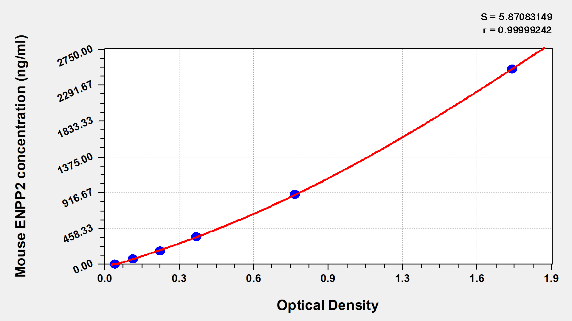 通過線性范圍來計算出實際的檢測樣本值,定量試劑盒標準曲線的相關系數R大于0.99。以CSB-E07270h(人脂聯素(ADP)ELISA Kit)為例的標準曲線。